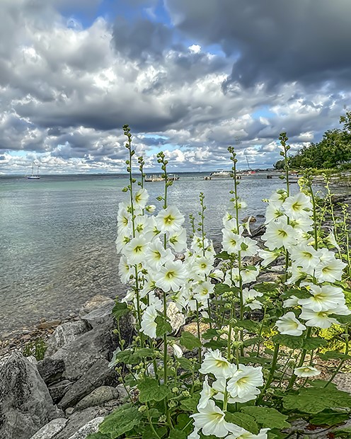 Hi Ingrid - How wonderful it is to spend a summer on the lake! You've captured an interesting sky and who doesn't like hollyhocks? So if it were mine, I'd consider retaining both by cropping from the left. I do like Tom's suggestion of blurring the background if you're wanting to retain the beauty of the distant horizon. Inspiration can strike when it's least expected; how handy it is to have an IPhone within easy reach! |