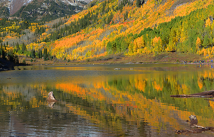 Great shot. I have always wanted to see this, but haven't made it yet. The reflections add a lot to the scene. I haven't seen images of Maroon Bells for a long time, but I always here that we have to find our own image at such places, but that is hard to do. Just to see what the reflections would look like as the focus, I cropped it. It is beautiful the way it is and I can't see anyway to improve it. |