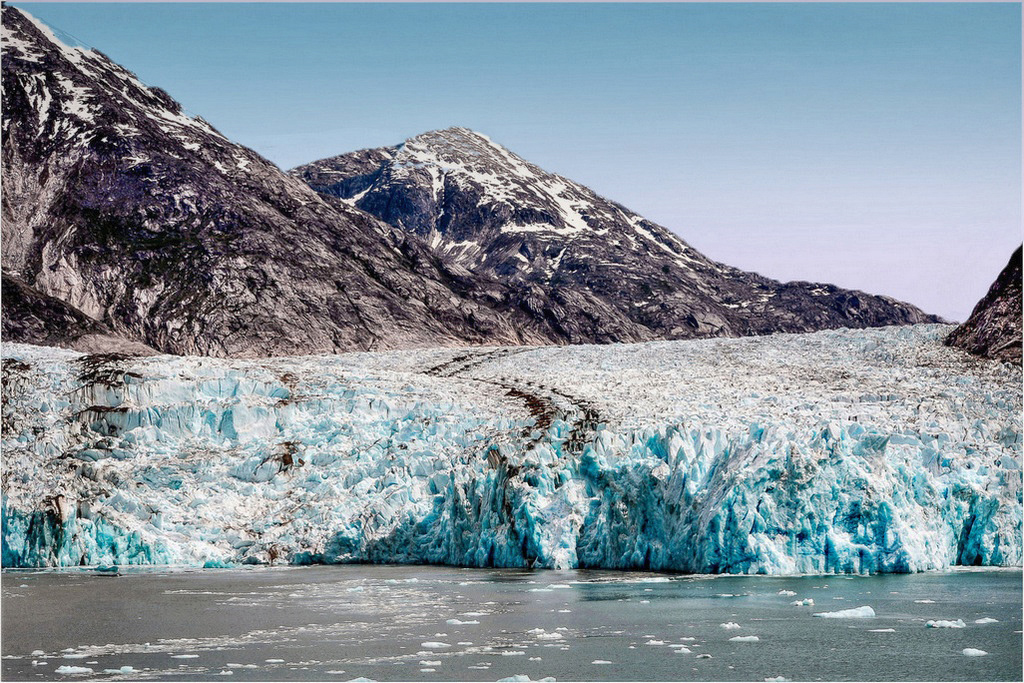 Blue ice is surprisingly blue and I am amazed every time I have seen it both in Alaska and Antarctica. It is too bad the glacier is so dirty, but that is part of the way they are naturally. It would be hard to get this with a person or animal. One can hope for a minor calving! I darken the sky a bit and brought out some detail in NIK |