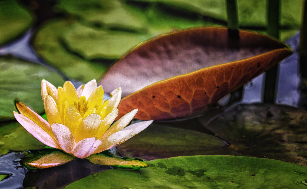 I have the same problem and always have to look them up. This might help https://www.mnn.com/earth-matters/wilderness-resources/blogs/whats-difference-between-water-lilies-water-lotus.This looks like a water-lily. I think this is too cluttered and the light is harsh which you probably couldn't avoid. I did some darkening and cloning and I think made it worse! Tey to get them early in the morning--that is always recommended for the local Aquatic Gardens. |