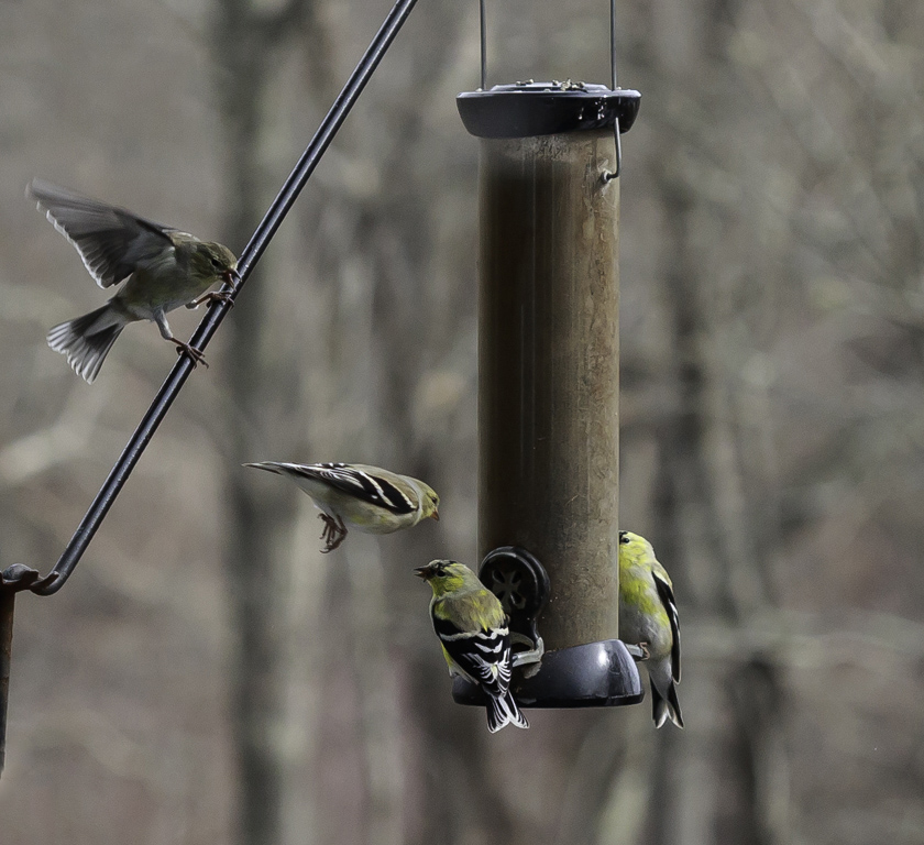 Nice capture! The birds cooperated with nice positioning for you. Just 2 little nit picks--the piece of wire sticking out in the lower left and the bright spot along the right edge bothered me so I used content aware fill to get rid of them. Since this would not fit in nature anyway, you can do whatever you want to it. I wish the background were a bit more out of focus. |