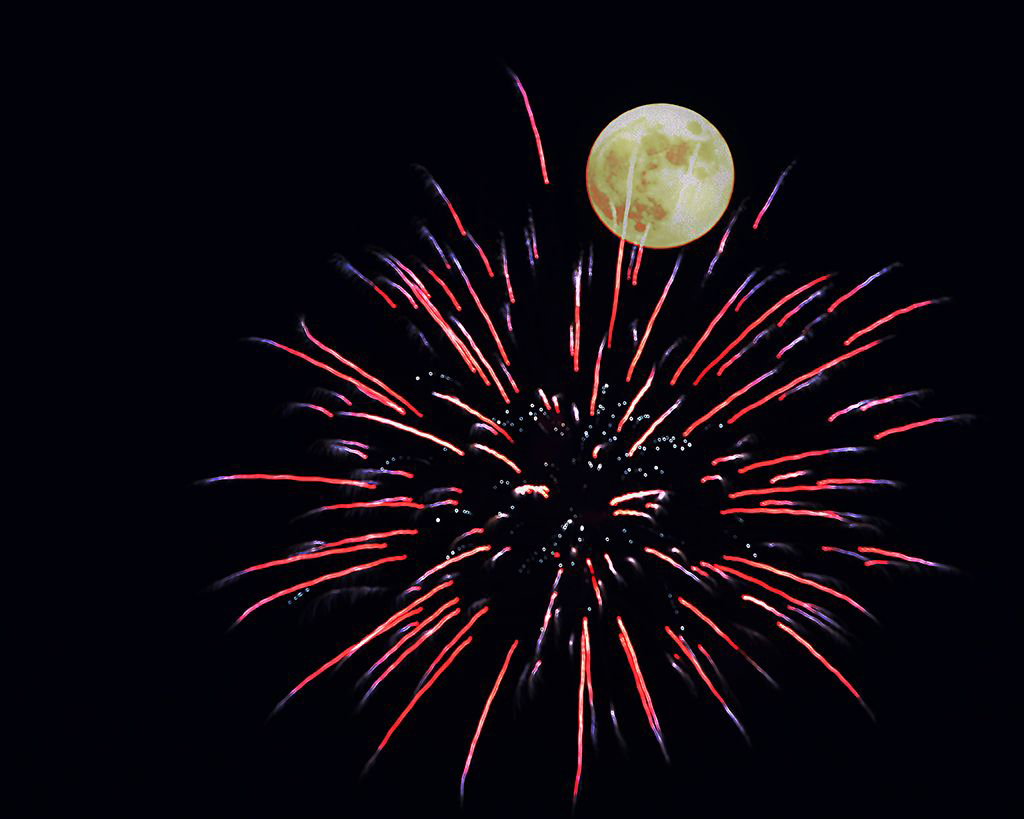 Good planning to find the right spot. I think most would take them separately and then put them together. I agree that the moon is too bright. I don't think did much to improve it, but I tried:-)The composition is excellent. We didn't have any fireworks here. |