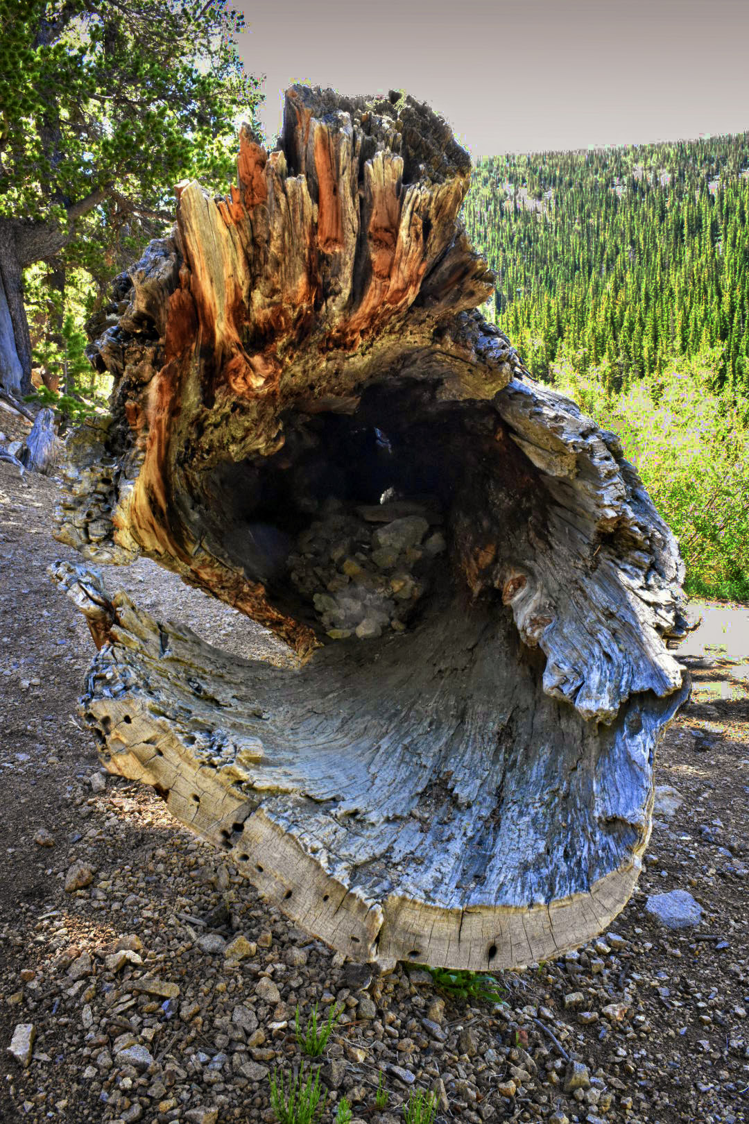 Good seeing. The texture of the log is a drawing point. You had difficult lighting challenge. A different time of day might have helped. Obviously, you need light on the detail and center of the log. Karen's version is very nice. I tried, but didn't do that well:-) Adding a better sky is a good idea. The image has a lot of possibilities. |