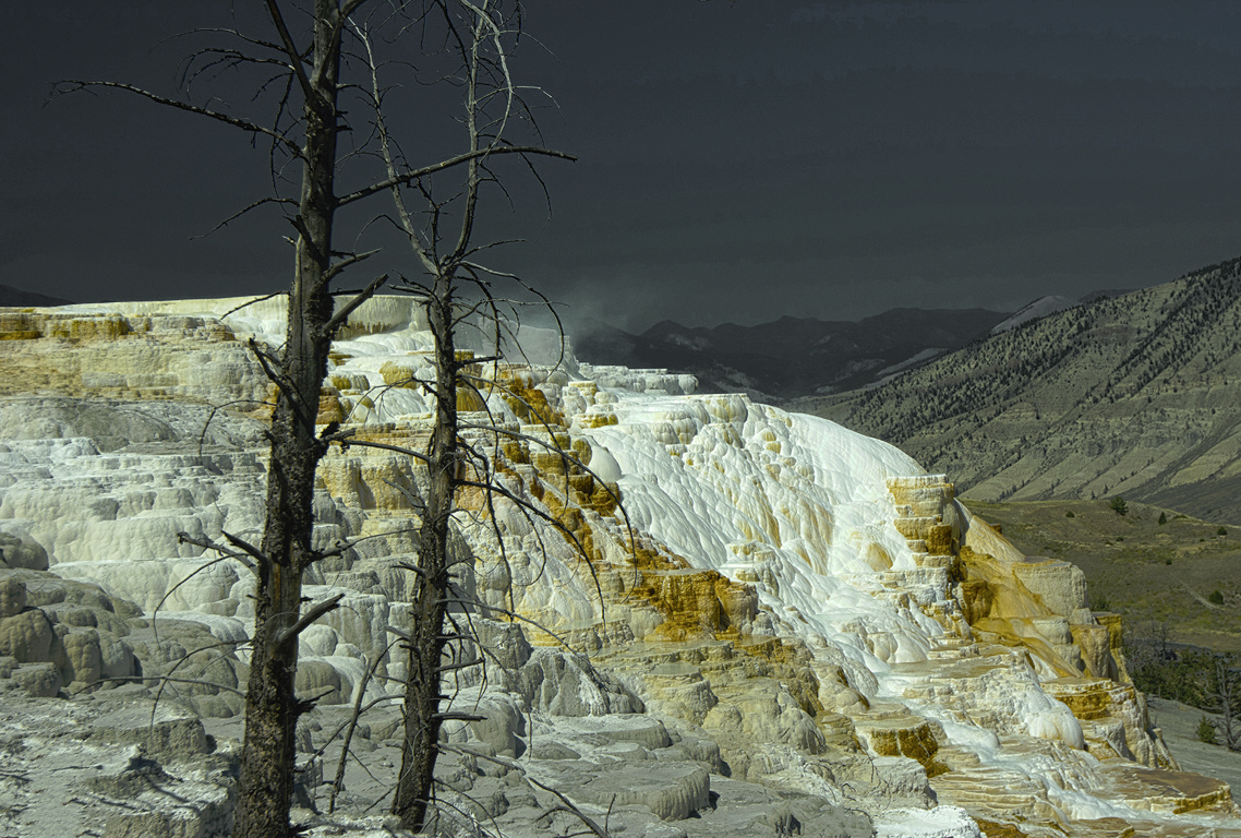By cropping a bit from the top, Dorinda's image reduces the uneasiness caused by the somewhat unnatural color of the sky. I tried making it a more natural blue, but that didn't help much. By going in the other direction, the formations are emphasized, and at the same time, the trees become less of an issue. |