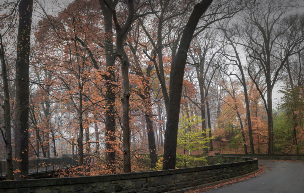 Well, this is pretty dreary to me compared to the brilliance I remember of New England foliage. Here is a modification where I've added vignetting and reduced saturation and I wonder if you find that this helps make it more dreary than my original attempt. |