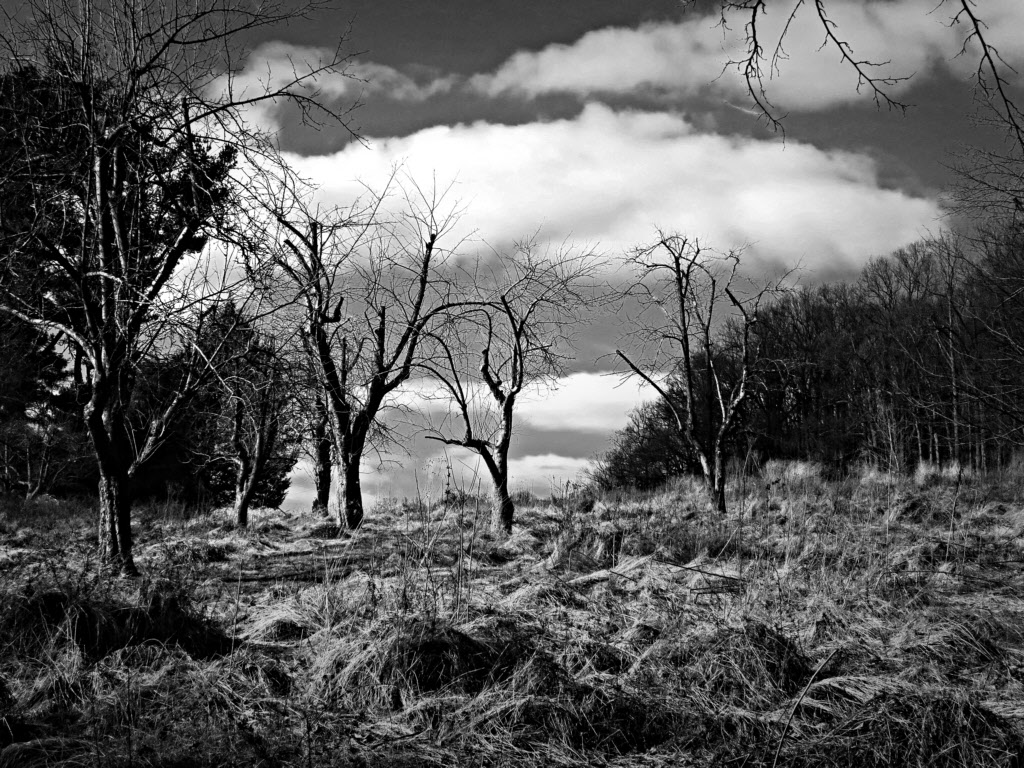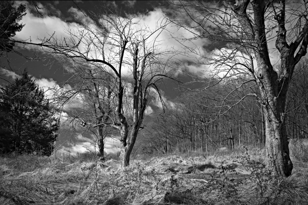 I guess that my submission this month should be classified as a hybrid. On my first outing my objective was to practice identifying scenes suitable for B&W, and I stumbled upon this old orchard against the sky. Later, at home, this shot seemed to be the best of the series, but it was obvious that it could be substantially improved by putting a single tree against the sky. Hence, I returned a week later with this image in mind and took a series with only one barren tree against the sky. So, random chance followed by a preconceived shot. |