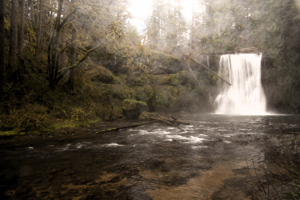 What a fantastic scene. It seems like you got the exposure time just right to make the falls look feathery but still keep the nearby ripples in the water sharp. I guess a lens hood for your 16-300 wouldn't provide much rain protection, but hoods for longer focal length lenses do protect against rain. Instead, you needed you needed an umbrella and a helper. Because there are quite a few raindrops, they almost feel like part of the scene, and they don't bother me. Taking out one or two is feasible, but not this number. Removing the log was fine, but I find your increase in saturation to be too much for my taste. Here is a version I like better in which contrast only has been increased. |
