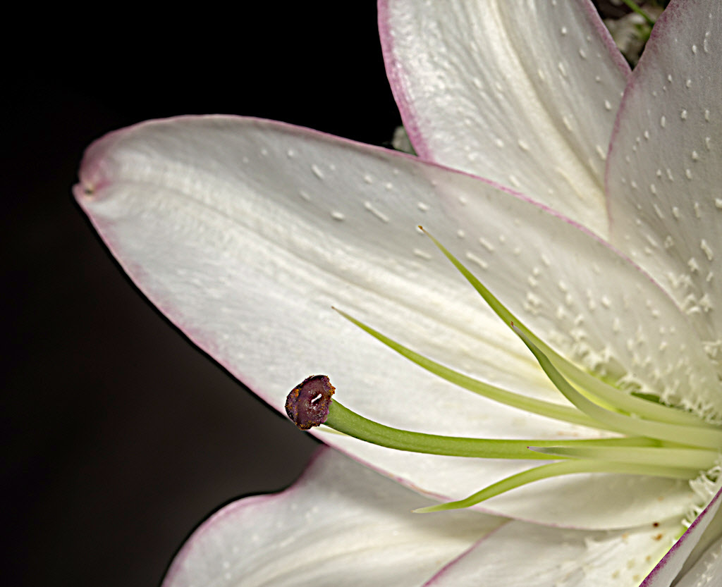 I wonder how this would look if the petals were in focus rather than the anther, but I don't see why the petals look out of focus since you shot at f/22. How far away from the flower were you, very close? The halo around the anther suggests rather strong sharpening. Oddly, when I look at this, I suspect that the light source was harsh, but you used a diffuser, so I don't understand why the petals look they way they do. Technically, I'm a little perplexed by this shot. Esthetically, all I can say is that I liked your image of last month better. In playing with the image, I found that reducing contrast and increasing the brightness increased my liking of this image. |