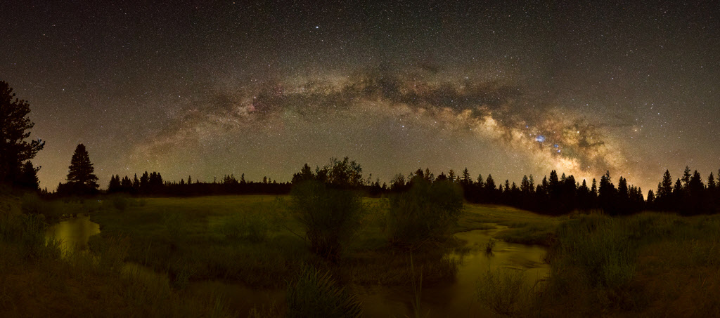 The Milky Way is great, as always, but the fact that the reflections in the water do not look like the sky above, gives me pause. I think Judy at first felt the same. Sometimes I'm a little disquieted in 180 degree panoramas by straight objects like roads, fences, rivers, that in reality were alongside the photographer, but appear disjointed in the left and right extremes of the panorama or which, as in this case, appear to make a U-turn in the middle of the panorama. In this scene, the river, which, most likely is straight, appears to make such a U-turn. Finally, I am still curious about why the composite does not show evidence of the motion of the stars due to the earth's rotation over the interval required to collect all the stellar images. If the images were merely pieced together making use of overlapping regions, some stars would end up down in the trees and in another part of the image, there would be a band of sky just above the tree tops that would be devoid of stars. Could you please take a close look at the original images and at the composite to figure out what is going on (and then let us know). To me, suppressing the fainter stars reduces the naturalness of the image. |