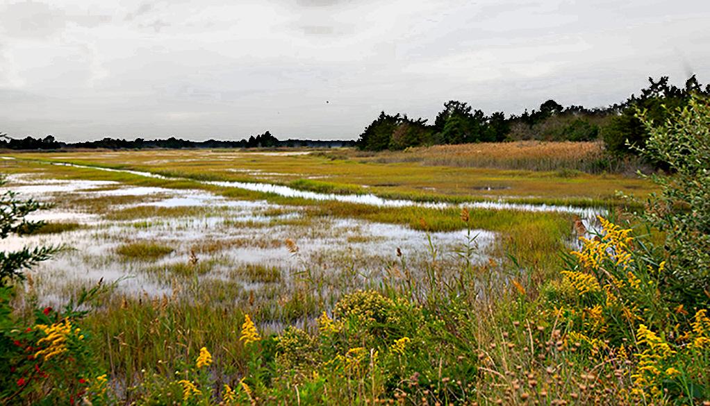 To reduce the large area of almost featureless sky, I increased the contrast of just the sky and then cropped to reduce its area and move the horizon out of the middle. I also increased local contrast of the marsh to make it brighter and then I had to do a little diddling with a mask and tone curve to minimize a halo at the horizon on the left half of the image. The foliage on the bottom and right nicely frame the image, but the fragment of an evergreen on the left feels a little incidental to me. I'd love to visit a marsh like this as the image feels so much like Fall. |