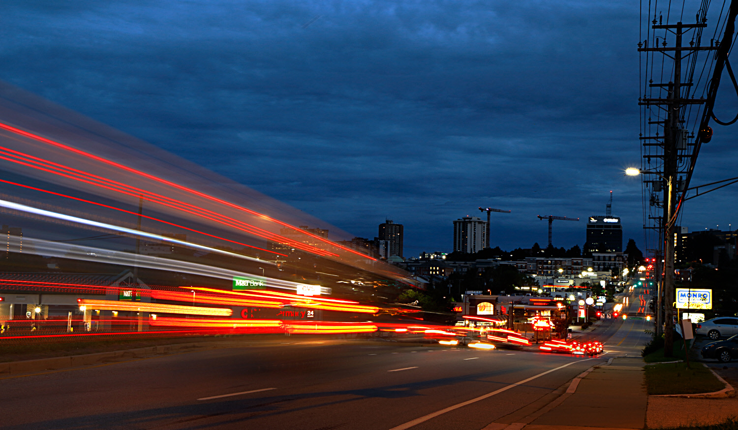 I have shots close to what you suggest, but the resulting very long red lines change the subject from an evening city scene to the red lines themselves. I see what you and Dorinda mean about the crop and I agree that cropping from the bottom improves the image, but I would prefer to crop only half as much as you and Dorinda suggest. The reason I don't want to remove more is that any more impinges upon the (implicit) car producing the nice red trail. |