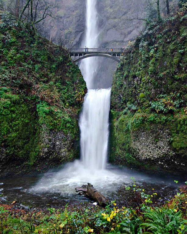 What a fantastic waterfall. A rainy day was the right time for this shot. The colors are more saturated on such days. I also like the slight blurring of the water in the waterfall--just right. The cropping fits the shape of the falls. Initially, I thought the brightened green near the lower falls was appealing, but after a while it began to feel artificial and overemphasized. Here is a version that I've brightened and sharpened a bit that I'm a little more comfortable with. I wonder how this would look if it had been shot from five feet to the left or right so that the log wouldn't be right in the middle. Maybe clone it out? |