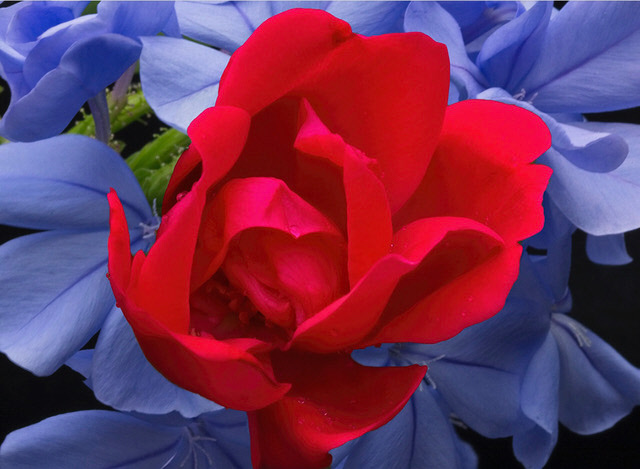 That is really lovely. What makes it for me is the difference in color saturation, with the less saturated blue forming the background. (I don't think it would work at all to have the background highly saturated and the flower in front being unsaturated.) I agree with Dorinda that it would likely improve the image if the rose were obviously sharper, and perhaps it would also improve the image if the background blue were blurred just a tad. I wonder if the image would look even more real if the top edge of the rose were just a little less crisp as that top edge is sharper than the interior edges of the petals. I tried blurring the edge, and it seemed to help for me. |