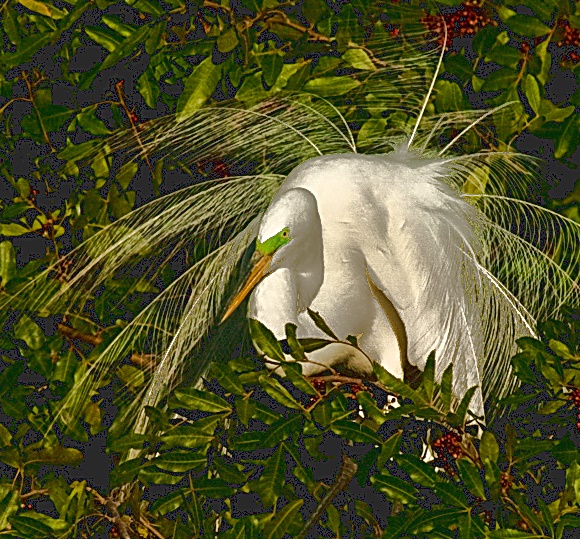 It must be nice to see a bird this beautiful in the wild. I agree with Leonid that there is insufficient contrast in the Egret. As you folks are aware of, I like to see more of the background or surroundings in my shots that you do. In my image below I've increased contrast in the Egret, brightened the background, and cropped to make the bird more prominent. I've also tried to sharpen, but there is a limit when you are starting with a small jpg and crop significantly. I think that the grey region along the top of the body and head are a result of some initial editing of the image. |