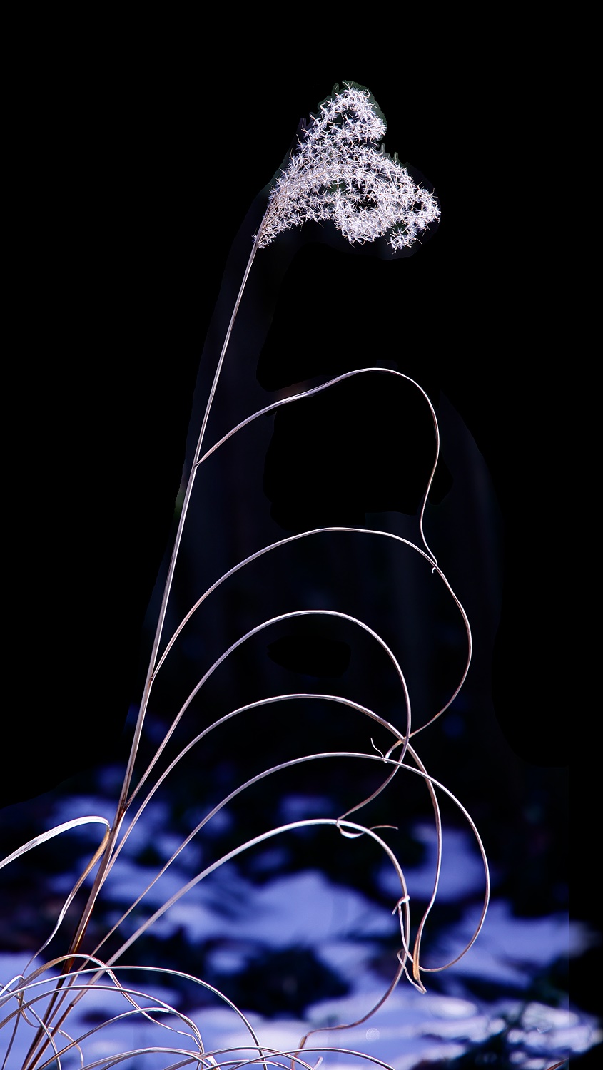 Here it is with less on the left and more on the right, as suggested by Dorinda, and processed with considerably more care. I've spent more time on this grass than on any image in the past year. After this was taken, on three more outings I've taken perhaps twenty more shots (with exposure bracketing, perhaps 100 total) and carefully processed three. All of the newer ones included this original grass plus three others of similar shape cascading off to the right, each smaller than the preceding . In the end, my first shot feels the best to me. |