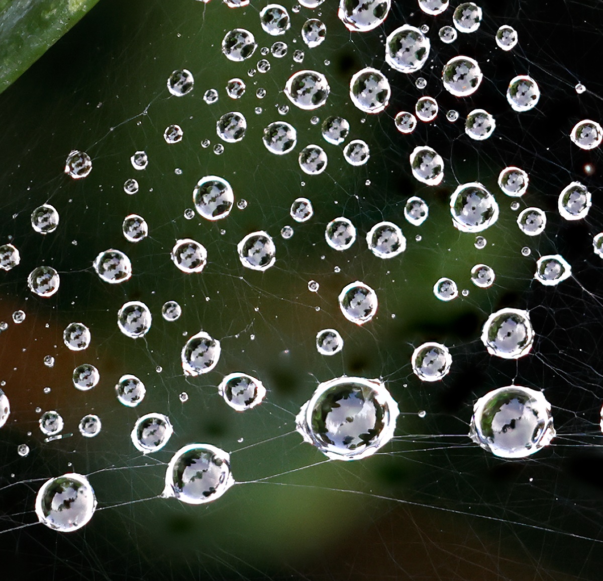 Yes, you can see something in the droplets. Here is a crop that displays the web without the distraction of the pine needle. |