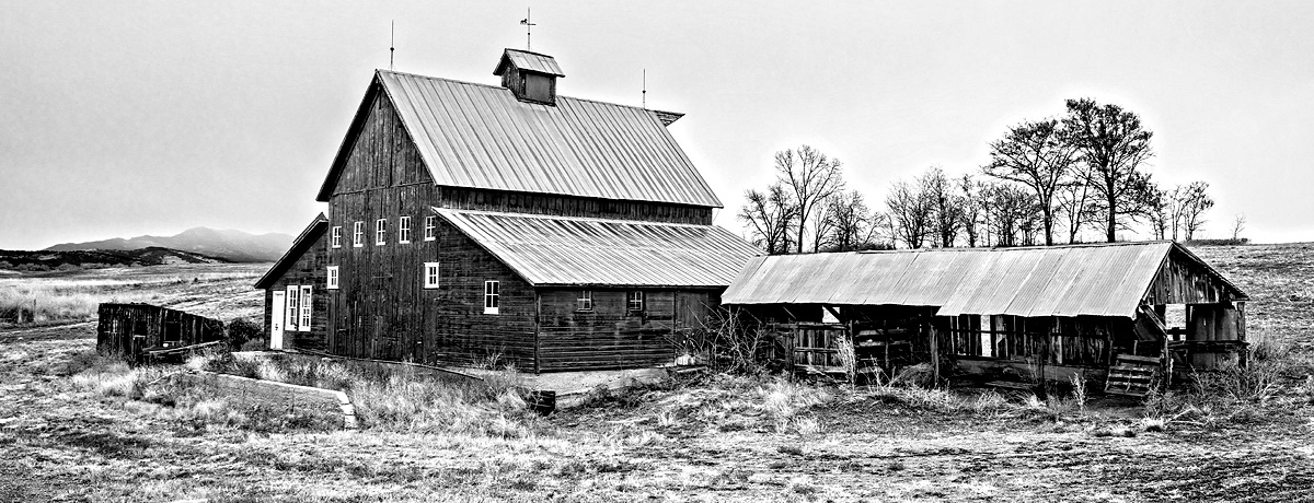 I like the choice of the barn and shed, the position from which the shot was taken, and the decision to convert to B&W. I'd like it more if it didn't look like the trees on the right are coming out of the ridge of the shed. I also like it more when still more of the white sky is cropped off as well as some of the foreground. Finally, I like B&W images to have some pure white and pure black, so I upped the contrast a bit as well in this reworking. |