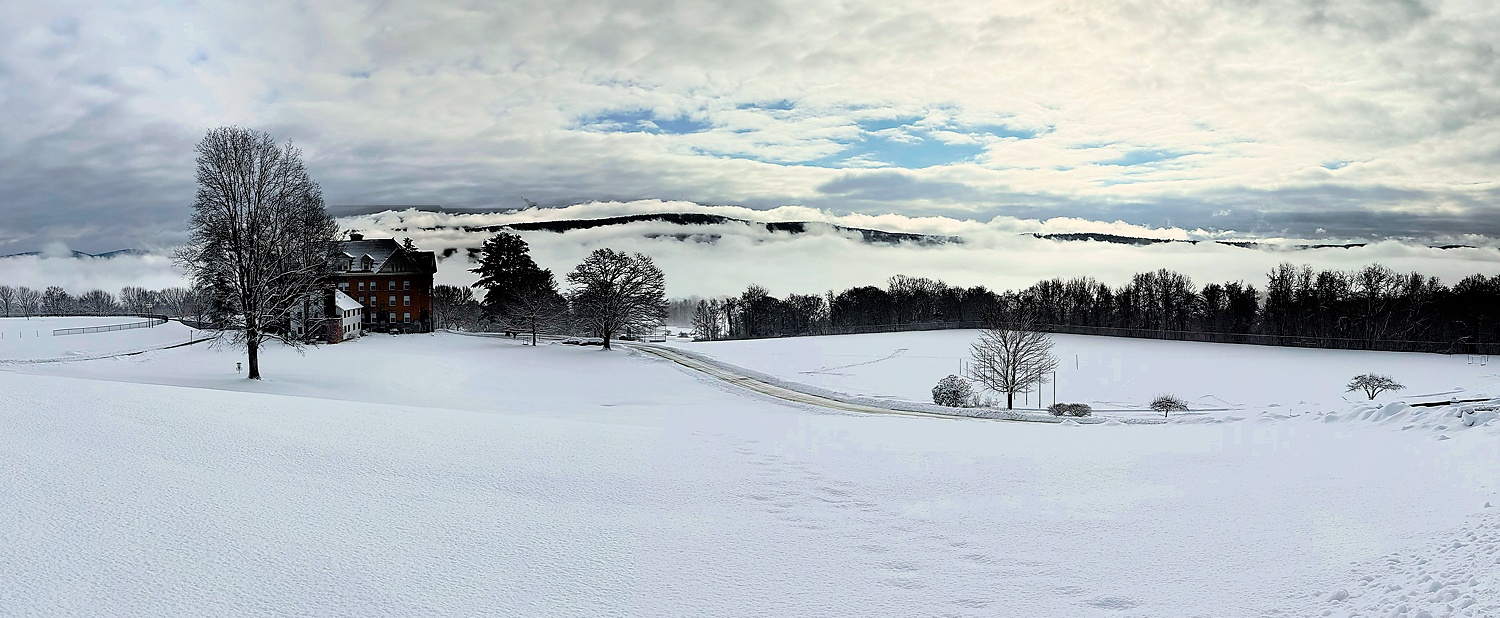 Landscape orientation might, indeed, have been better. I was thinking that landscape mode would have included most of the two trees whose branches I did use to frame this picture, and I felt that their trunks would intrude on the scene. Perhaps, however, the top qurter of this image could be cropped. In that case though, the image would have been nearly square, which just doesn't feel right to me for this scene. Here is a multi-shot panorama including another building of the school. |