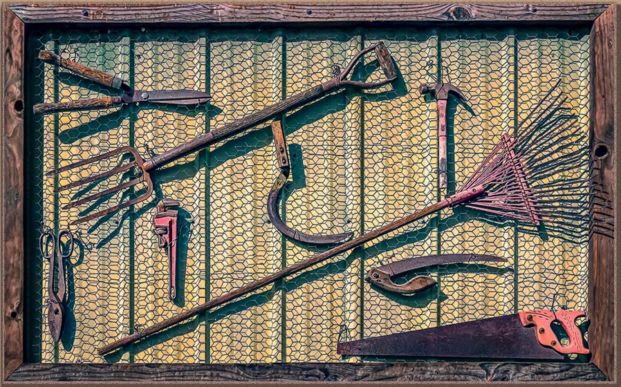 What an interesting way to hang tools! I like the arrangement of the tools and the way the shadows contribute to the dimensionality. I prefer the less obvious chicken wire of the original photo, as I think this image is about the tools, and not the hanging material. To my eye, the border is too wide and does not add interest. I suggest cropping the image so that just the wood frame shows. |
