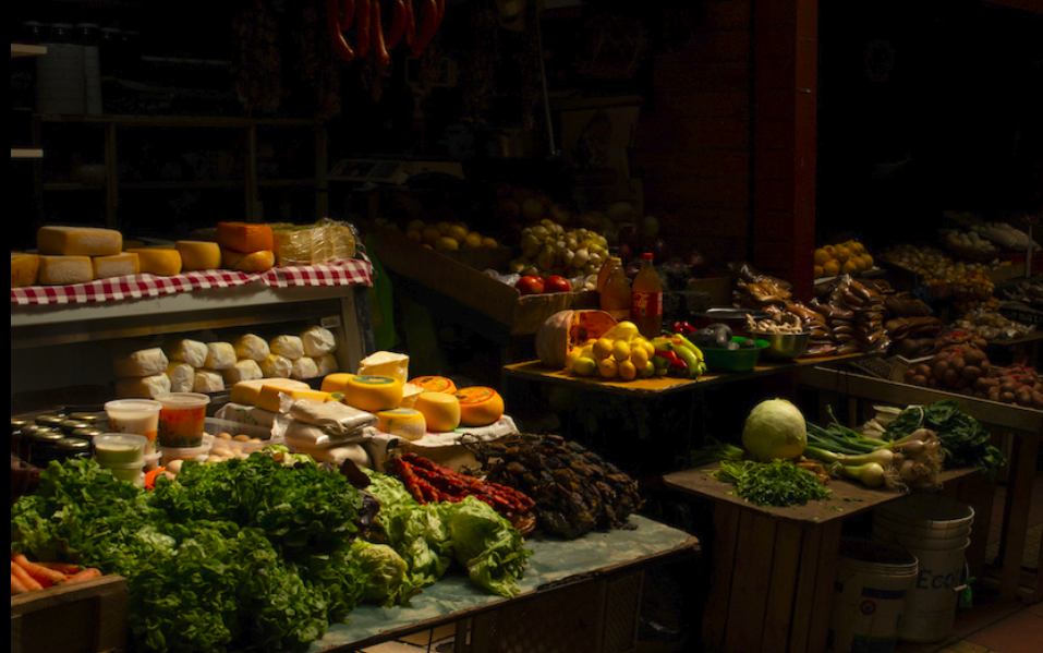 Food stalls are such interesting subjects! I like this one because of the variety of items-fresh vegetables, cheese, soda bottles, and the sausages. I do like what you did with the sausages and I want to see more of them. Have you considered bringing them out of the shadows a bit more?