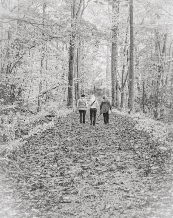 When I looked at this image, I was sitting inside with a cold wind blowing outside. So my first impression was of three friends walking on a frosty winter day. I think the texture and the white vignette give the image a lovely ice crystal, frosty look. I can almost hear the footsteps crunch on frozen leaves. I like the mood you created and that the image makes me wonder what those friends are discussing.