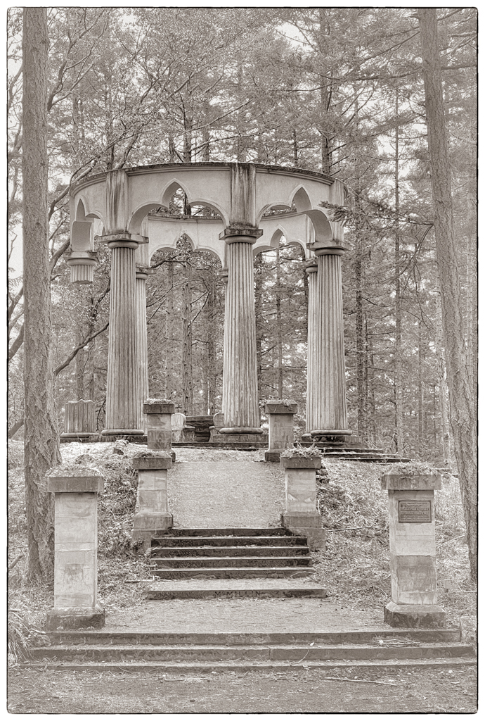 Thanks for the suggestion. Before I made this image, I made another version quickly (which I deleted) that popped the mausoleum in front, sort of similar to your suggestion. But having lived in the Northwest (many years ago), I decided I liked the way the McMillan family placed the mausoleum so it would blend with the Pacific Northwest forest. HOWEVER, I think I will now try to soften the background by using a blur effect. That might work towards the same end you suggest without making it look like the fog rolled in behind the mausoleum. What do you think? |