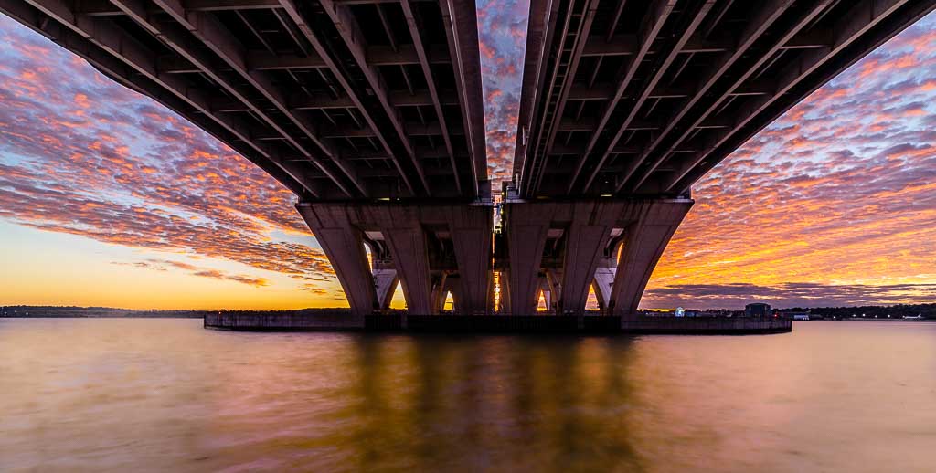Great image David. I like the strong lines of the underside of the bridge. The colors in the sky seem ok for my eye. I would like to see a little less of the water and more of the sky and bridge, so I cropped out a little in the attached image. |