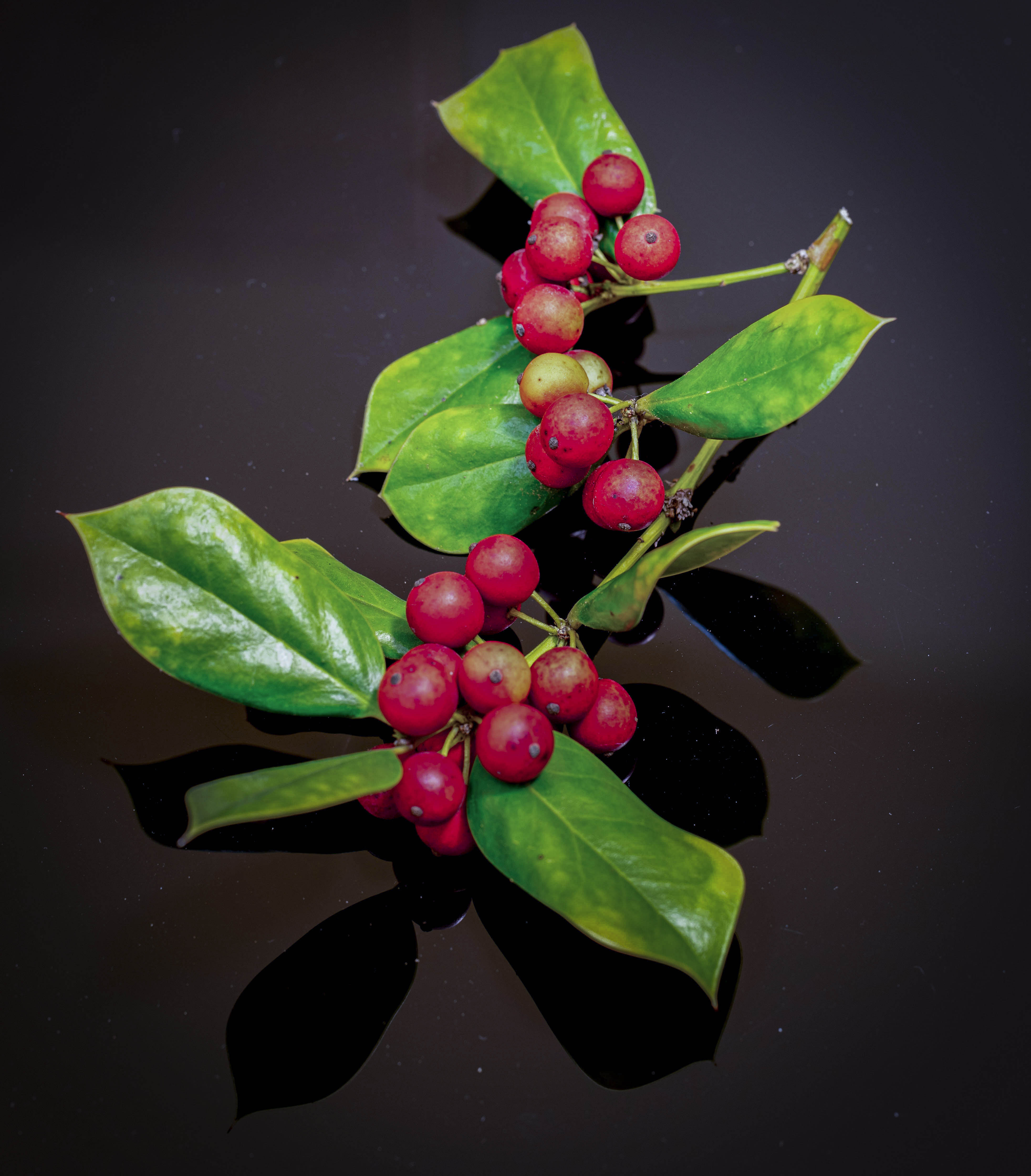 How nice, you have your own Christmas bush! I think when you intensified the red, that it brought out more of the yellows in the green leaves. I took your photo and only did work in Adobe Bridge to add more blue to the image and increased the texture. I also brought the highlights down and darkened the image a little and added a vignette to "contain" sprig. |
