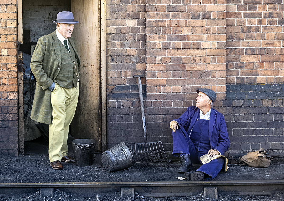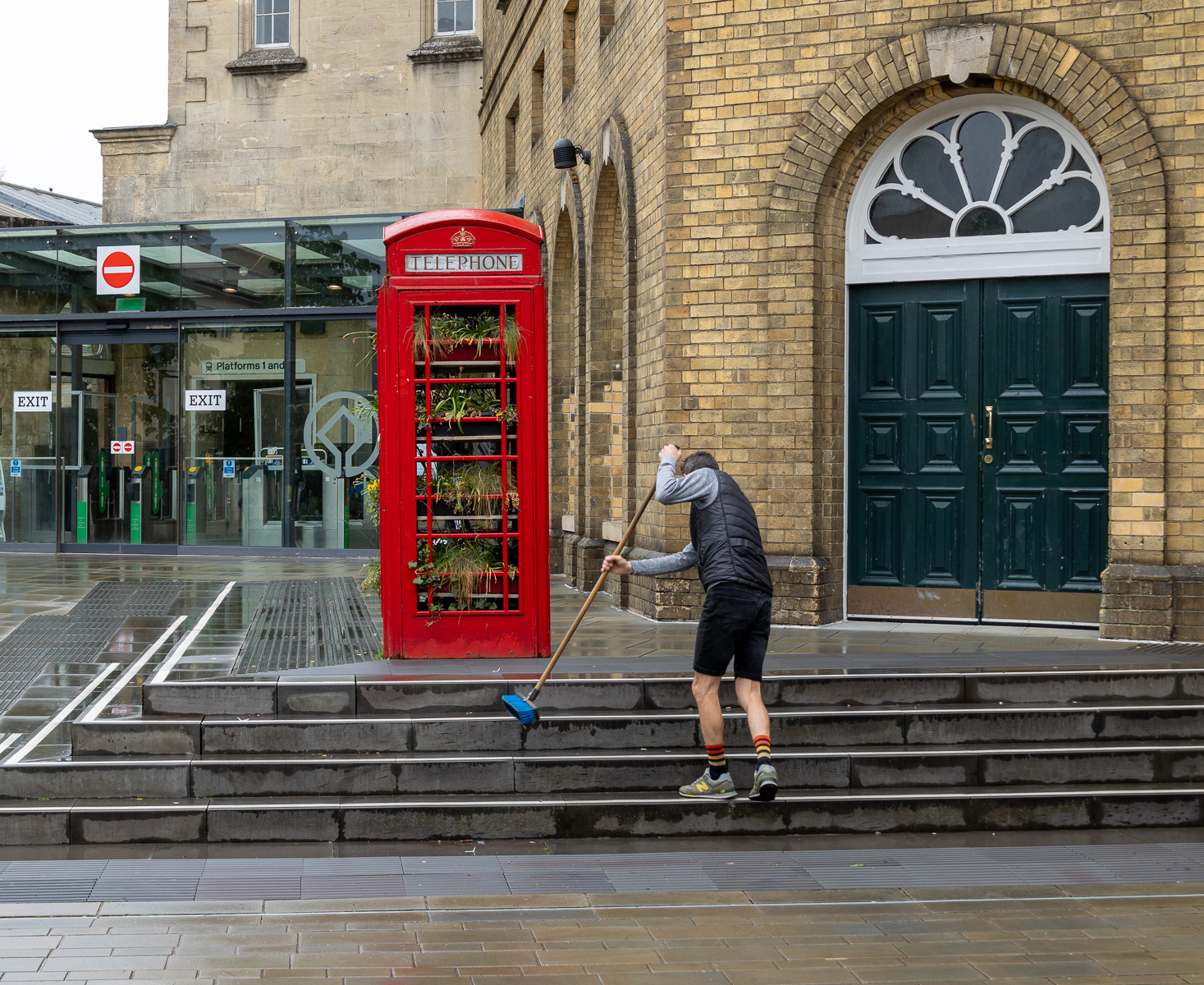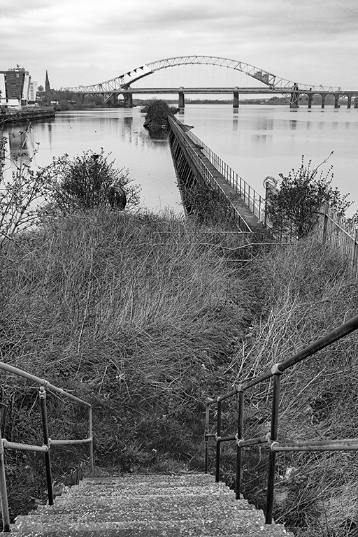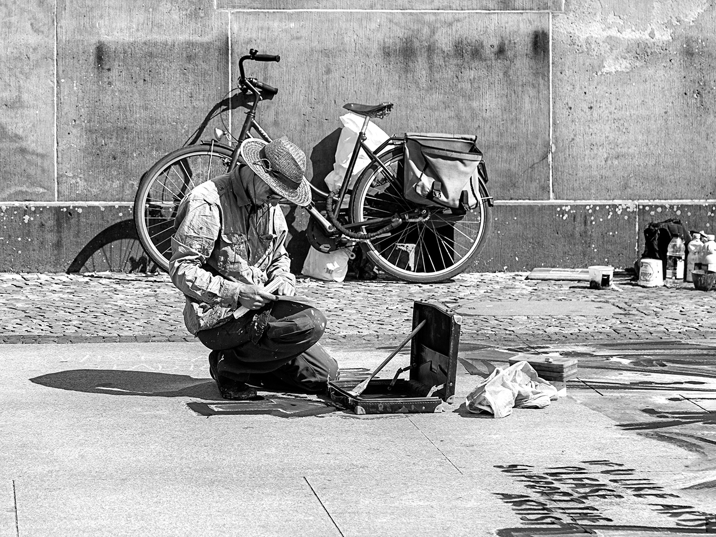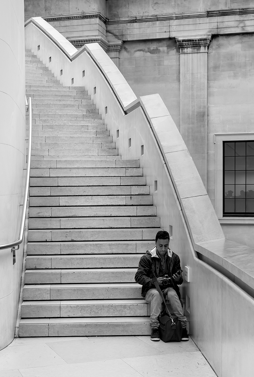 I like the b+w as it removes some of the distractions in a very busy scene, but would consider a different dof and removing the right hand edge, thereby excluding the man on the crossing as he doesn't add to the story. |
