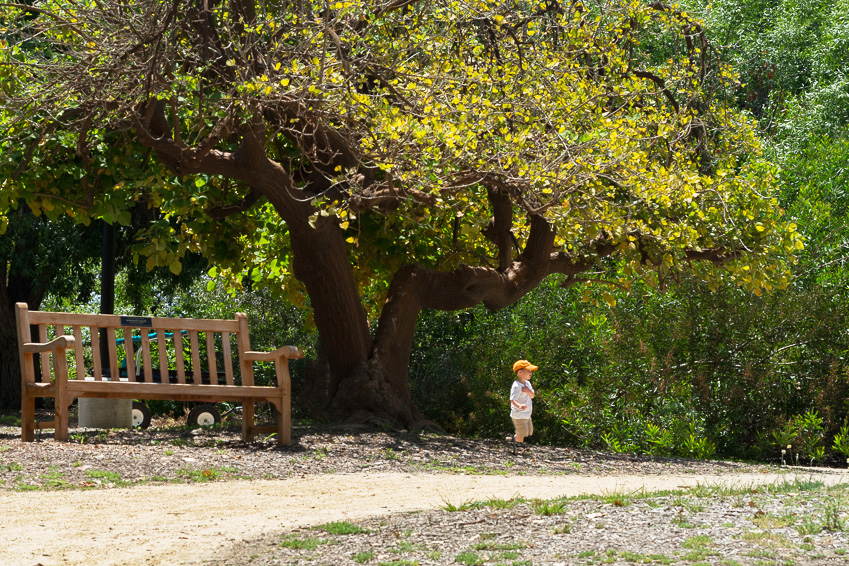 I like the bench as it make the boy look so small, but agree that there's too much space and the boy needs to be more on the third. I tried flipping the horizontal which also made the path come out of the left corner and lead across the image to where the boy's heading. If you do this be careful about words on the seat!