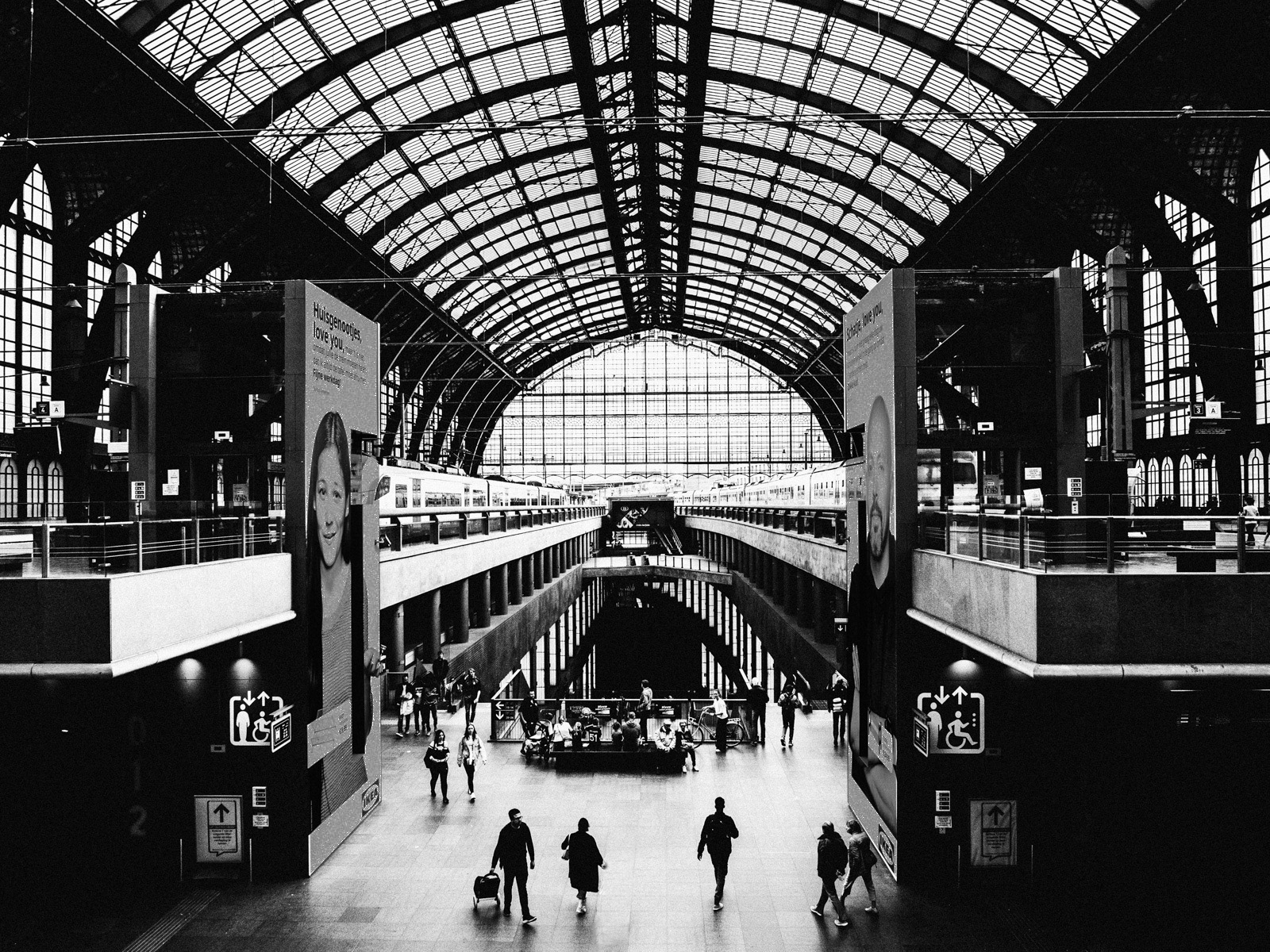 Hi Jason, definitely the right decision to go black and white to focus on the infrastructure rather than the scene, and I agree with the others that the huge posters are a distraction so I darkened them down so they are still there but the eye doesn't go to them as easily.