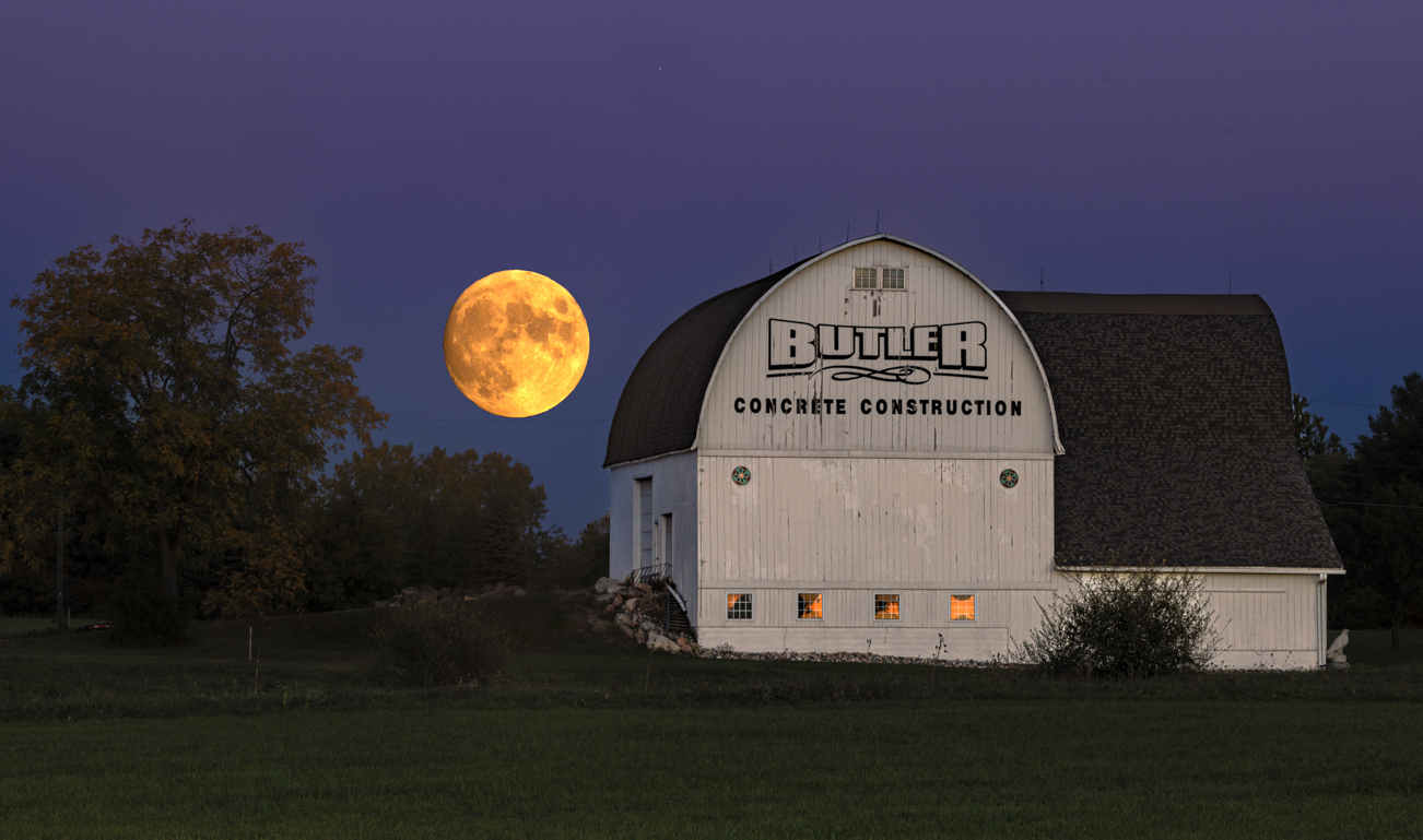 I prefer the bigger moon, it makes it's own statement, plus the fact that the colour is coming through the barn windows adds to its strength. I would also leave the grass as per your image, but darken down the barn as it's contrajour to the light source, and very white.
