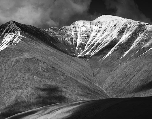 The light on the snow is beautiful, and overall tones are fine. I would prefer more sky and less shadow at the bottom. I cropped your image to a more or less square format, concentrating on the snow and sky. What do you think? |