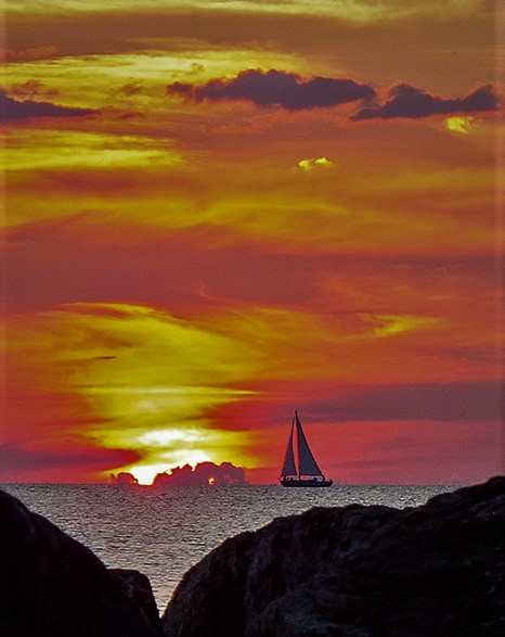 This is a very nice capture of a boat sailing into the sunset. Ditto on the crop suggestions. However I would leave the V-curved in tack and use it as a leading line toward onto the sailboat. |