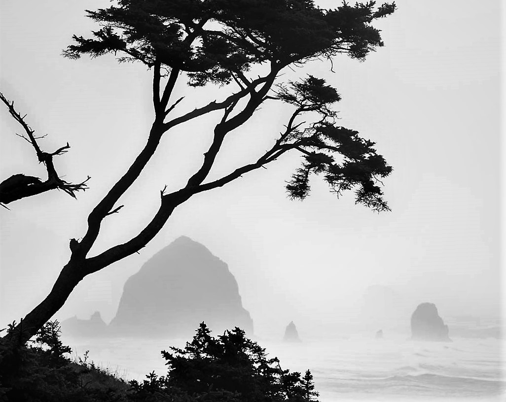 A great feeling of atmosphere in this B/W image. I like the trees in foreground which frames the haystack rock and adds some interest. It's certainly very sharp. I did notice that you named "Haystack Rock" as a title. To make the main subject stand out, I took the liberty of applying LR to adjust sea level, increase contrast and clarity, and do cropping. Here is new version. |
