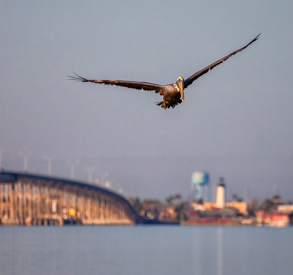 What a nice capture with the wings nicely spread. The motion, colors, blur background, and sharp detail of the pelican are really good. I think the image would look better if it were cropped to remove some of buildings on the the left and the right and adds a bit lighting. The attached is what I came up with.