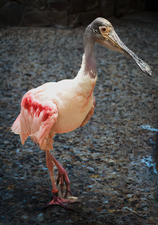 Isaac, I love this spoonbill. The color is much brighter and prettier than ones I have seen at the zoo. I like everything about your photo. When Marie added the content fill to the right it had a different look than the other foliage. I even like the limb shadows on the spoonbills. I am including my photo of the one I took at he zoo. |