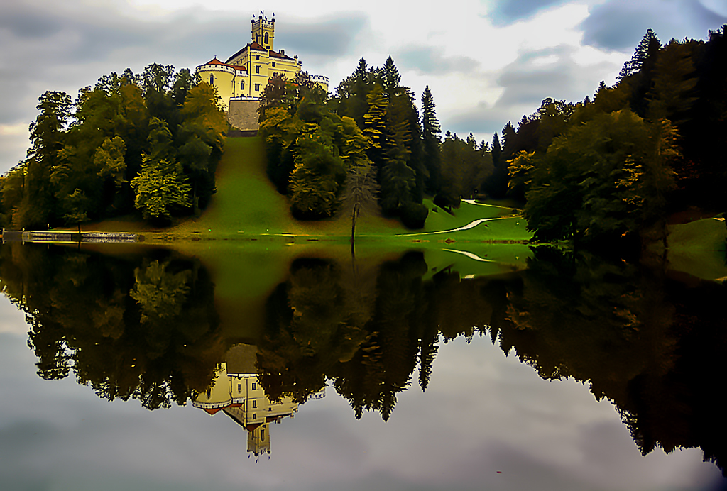 A beautiful capture of the castle and reflection. I took it into Lightroom cropped a little more from the left to remove the red dock and green pole and I enhanced the clouds a bit. I like your castle and reflection better ( mine looks a little too HDR) so I would probably put in a layer mask to just let my sky show through with the rest of the image as you had it |
