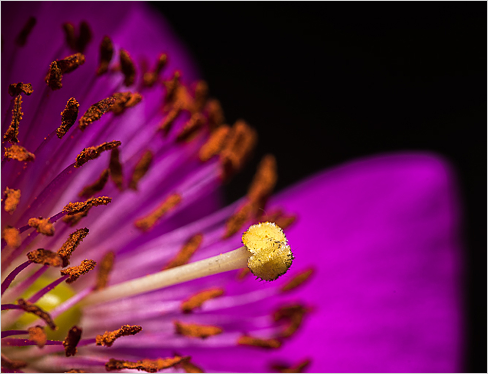 Beautiful colors with yellow stamen,orange-red anthers and purple flower Nice sharp stamen and some anthers. Since the left side is blurred it does not give the right feel I agree with Jessica and the use of a tripod. However I think a crop could save this particular image See attached |