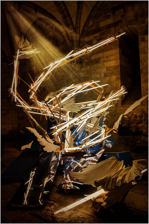 However,since you have added something by adding the light beams you have made this your own creative image of the sculpture.Perhaps going even more creative with Topaz Texture would work ( see my attempt) I like the juxtaposition of a modern sculpture against the medieval walls |