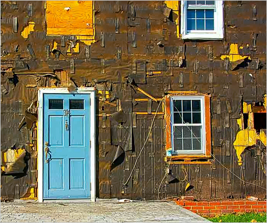 A nice sharp capture. You were trying to contrast the new door with the ruined facade and succeeded with this symmetrical image.