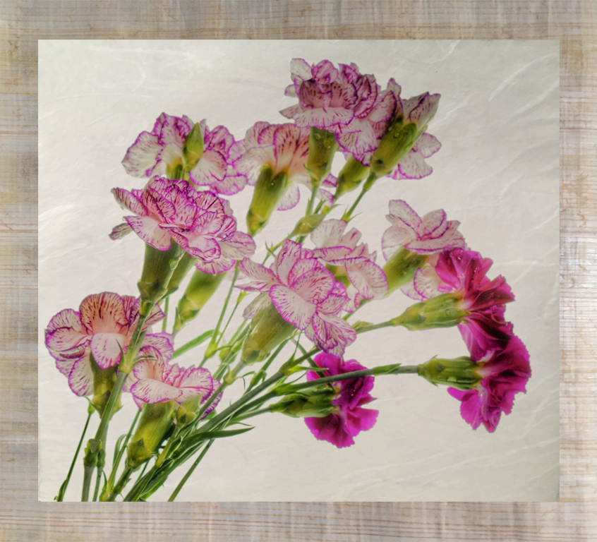 I found my rice paper and papyrus layered them and then placed flower image on top With flower layer selected I used used multiply in Photoshop CC to put flowers on background I then needed to brighten image |