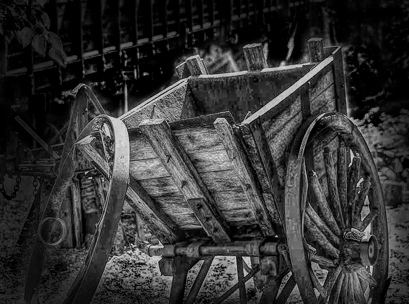 The color image is too bright and the HDR has corrected this. I agree with Dorinda's crop However I would darken the remaining bridge even more to make the cart pop To do this I took your original into Silver Efex pro and then Aurora HDR then back to Photoshop where I used a 50 % gray layer to dodge the background Then I used a black layer and eraser to make the vignette |