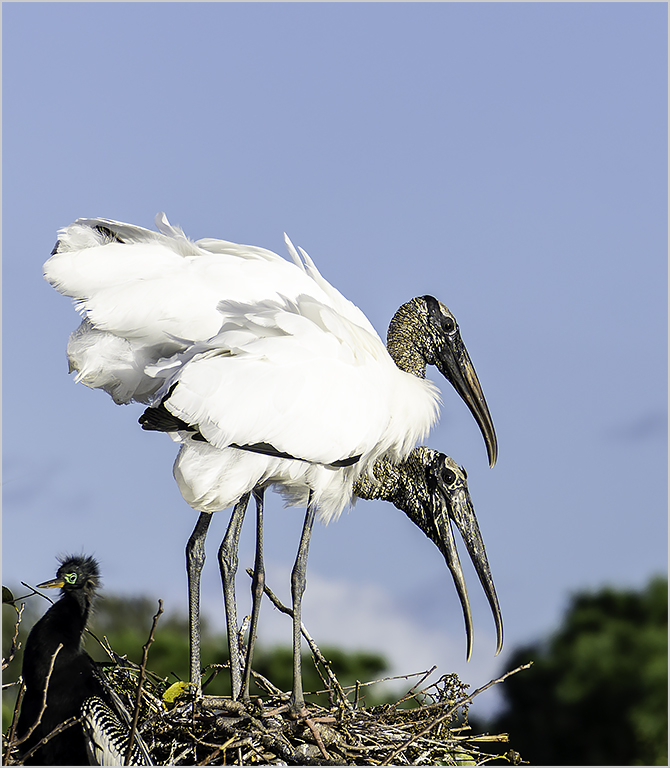 The birds were on a nest. The boardwalk is quite close to the nest at this point. Maybe fifty feet, but I am a bad distance estimator. In past years this tree island was full of Great Blue Heron , Double Crested Cormorant and Anhinga nests This year I saw only one Great Blue,several anhingas and the rest Wood Storks!