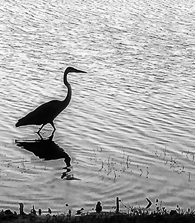Nice sharp capture of the heron Nice silhouette For me there was too much negative space above his head I attach a crop A shame the bird was so close to the shore I moved him further with content aware move in PSCC and made a beak shadow Obviously more work would have to be done to remove the dark water around the bird and reflection |