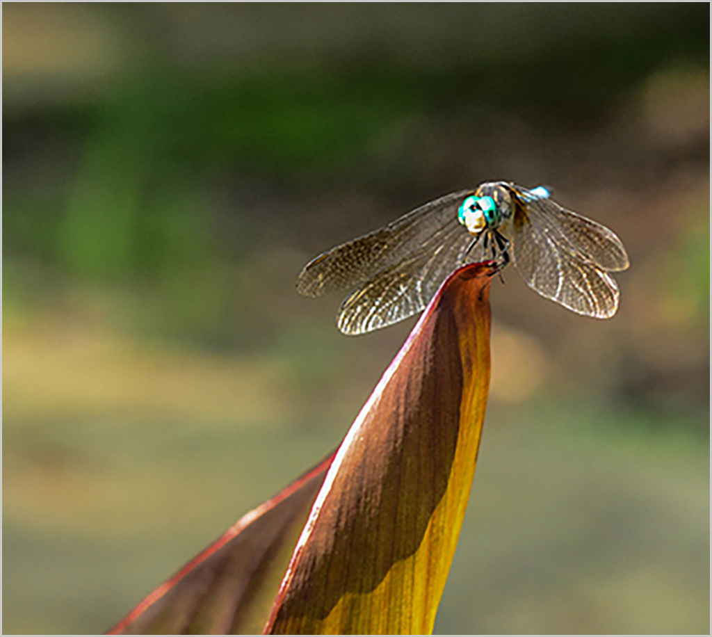 A nice capture of the Dragonfly. A lovely colored blurred background. I agree with cropping I feel the focus is the Dragonfly and the leading line of the leaf leads right to the Dragonfly I also sharpened the dragonfly and cut back a bit on the whites near his eyes |