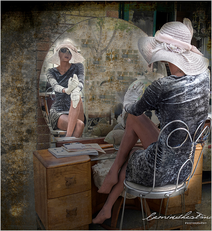 Another interesting creative image I would crop in tighter ,clone out the blue bungee cords holding the mannequin in place and apply the great texture you have on the left to everything but the mirror image and back of the mannequin I would add the texture to the chair reflections in the mirror |