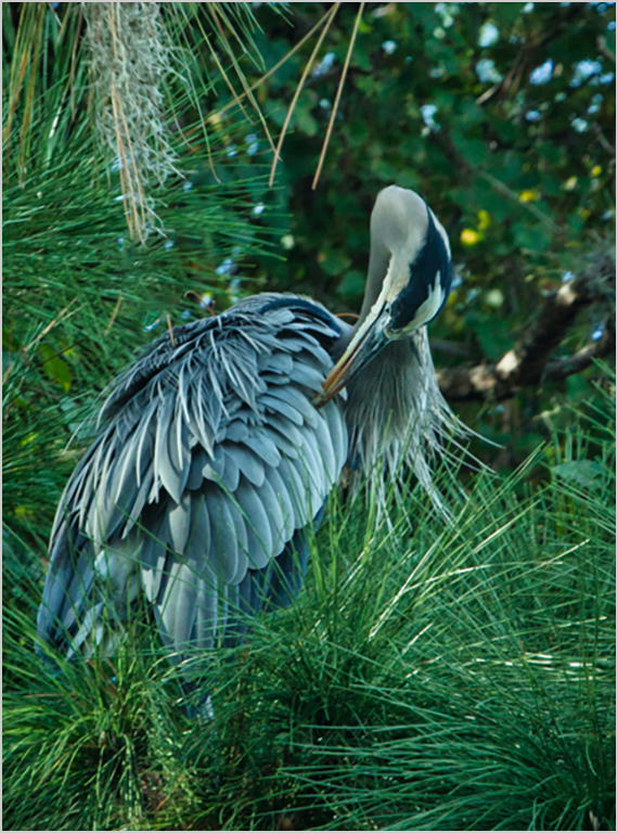 Nice picture of the Great Blue preening. I think it is too far away so I cropped in and sharpened the eye I also cloned out the blue flare to left see image |