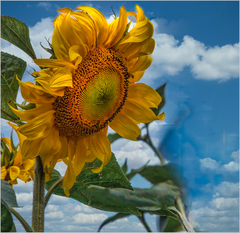 Beautiful colors sharp sunflower I agree that I do not think the windmill adds I would like a more straight on view to show more of the front of the sunflower