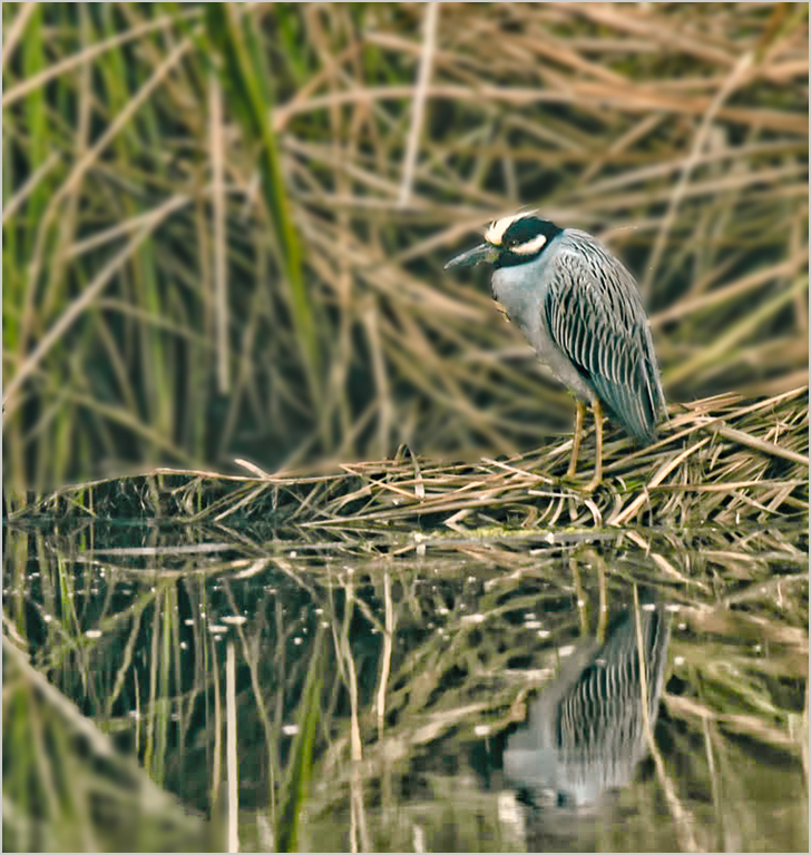 Nice view of the secretive Yellow crowned night heron with a good reflection that adds interest. A good shot for a birding list or an unchanged nature shot.However for a fine art image I think it needs to be cropped even more, sharpened, the grass across his wing cloned out or content aware filled and the background blurred as Leonid advised and did and a catch light added to the eye |